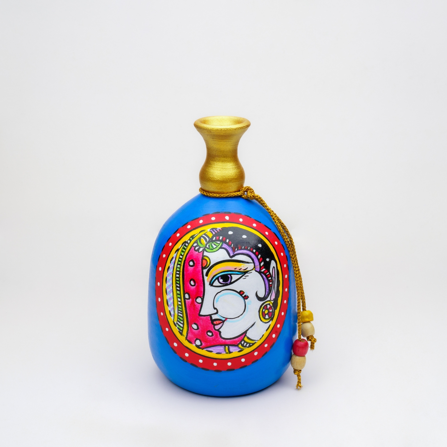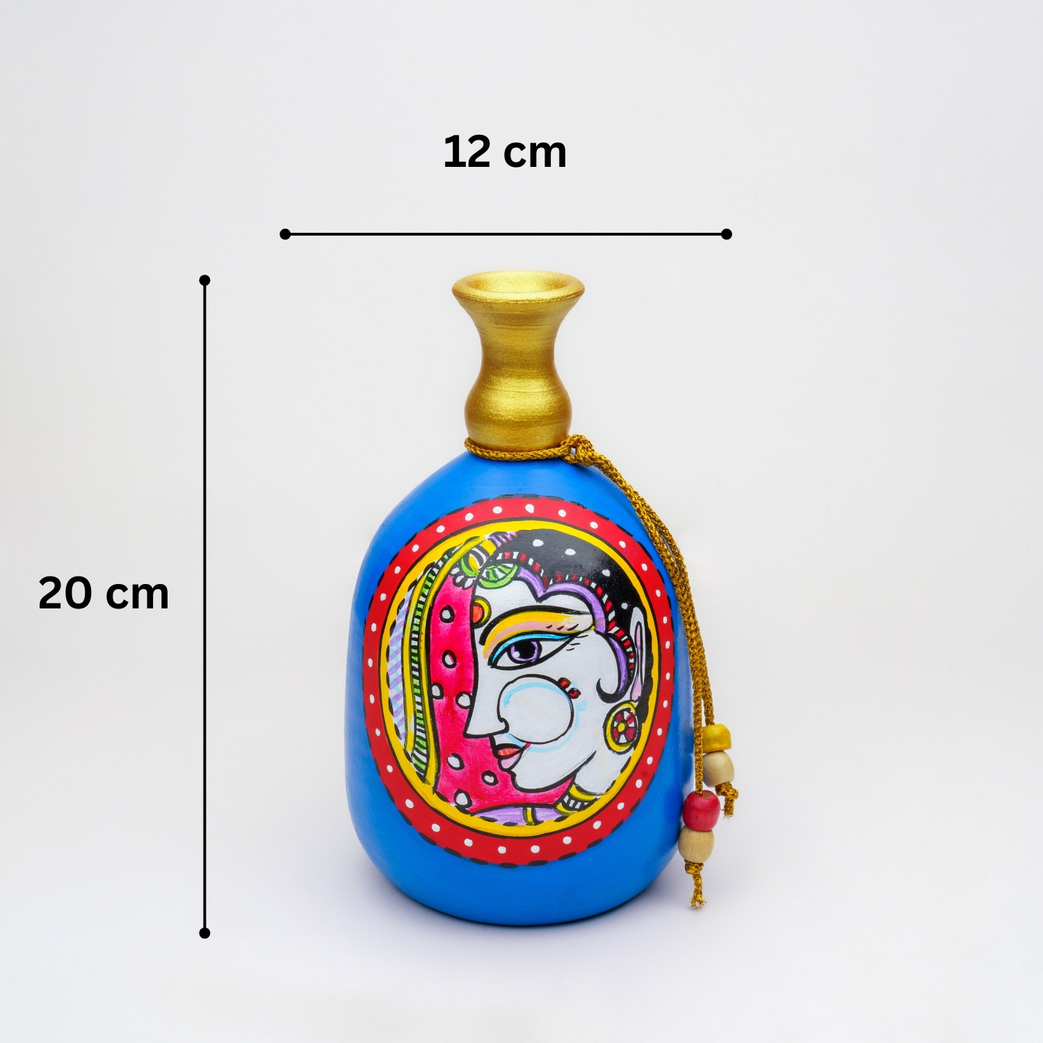 This stunning Madhubani painting beautifully captures the regal essence of a queen, adorned in intricate traditional jewelry. The painting features a vibrant blue backdrop, which enhances the richness of the queen’s attire and highlights her elegant ring, nathni (nose ring), and mangatika (forehead ornament). The detailed brushwork in the Madhubani style brings out the beauty of the queen’s expression, as well as the delicate patterns in her jewelry and attire, reflecting the cultural heritage of Bihar, India. This exquisite piece serves as a symbol of grace and royalty, making it a perfect addition to any home decor. Ideal for gifting, it celebrates timeless art and beauty, adding a touch of elegance to any space.